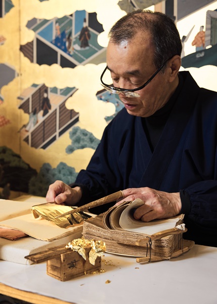 『サライ』2024年6月号 (8) 2024年5月9日 静電気が起きにくい、竹箸と和紙を巻いた天狗爪を使い、金箔の良否を一枚一枚確認する金沢の箔職人、山崎茂さん(77歳)。(金箔屋さくだ)『サライ』2024年6月号 「黄金の国「ジパング」の魅力に迫る!!国宝「中尊寺金色堂 内陣諸尊」の引き出し付録も美しい『サライ』2024年6月号本日発売!!」